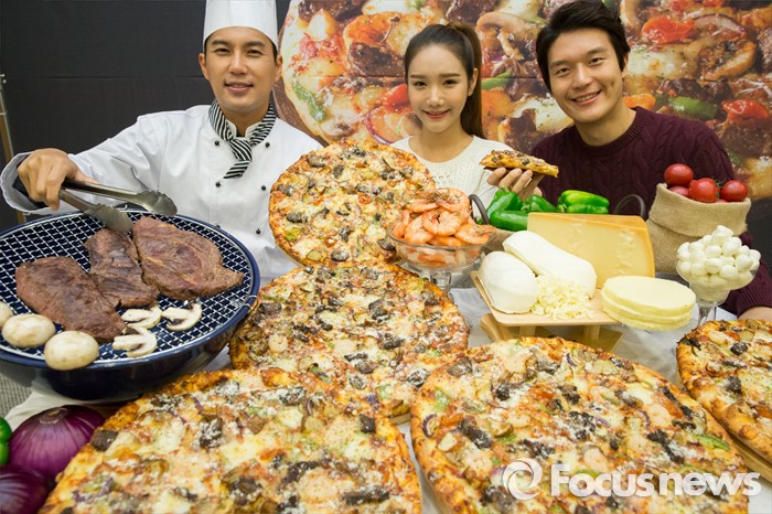 (서울=포커스뉴스) 19일 오전 서울 종로구 세종문화회관 예인홀에서 모델들이 도미노피자 신제품 '직화 스테이크 피자'를 선보이고 있다. '직화 스테이크 피자'는 불에 직접 구운 직화 스테이크와 탱글탱글한 식감의 통새우, 보코치니, 모짜렐라, 프로볼로네, 파마산 등 4가지 이탈리안 치즈가 어우러진 제품이다. 가격은 라지 사이즈 3만2900원, 미디엄 사이즈 2만7500원이다.