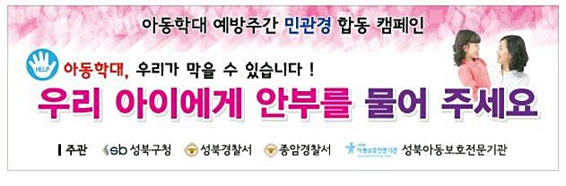 11월 19일부터 시작하는 캠페인은 성북구청, 성북경찰서, 종암경찰서, 성북아동보호전문기관 및 청소년육성회 등 아동 관련 모든 기관이 참여한다.