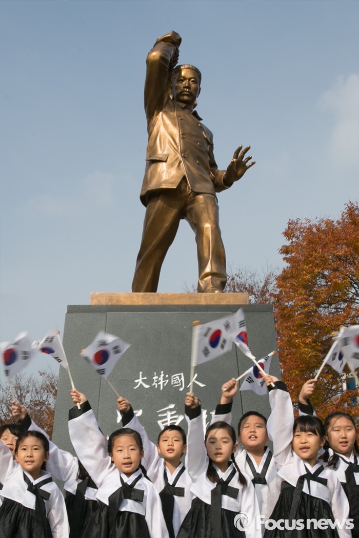 (서울=포커스뉴스) 11일 오전 서울 여의도 국회 헌정기념관 뜰에서 열린 안중근 의사 동상 제막식에서 역사어린이 합창단이 안 의사 동상 건립을 축하며 공연을 하고 있다.