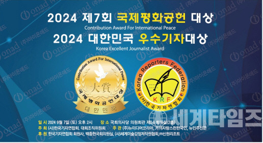 한국기자연합회(회장 이창열)는 오는 9월 7일 오후 2시 국회의원회관 제2소회의실에서 '제7회 국제평화공헌대상'과 '2024 대한민국우수기자대상' 시상식을 개최한다고 밝혔다.
