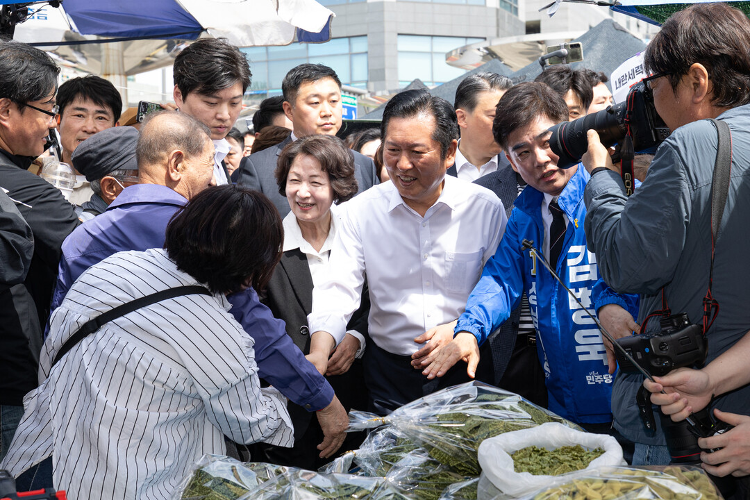 [부자동네타임즈 = 조영재 기자] 더불어민주당 정청래 대표가 19일 경기도 성남시 모란민속5일장을 방문해 시민과 인사하고 있다. 2026.4.19 [공동취재]