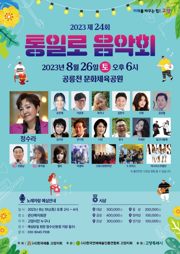 [부자동네타임즈 김인수기자] 오는 8월 26일 고양특례시(시장 이동환)가 후원하고, (사)한국예술문화단체총연합회 고양지회가 주최, (사)한국연예예술인협회 고양지회에서 주관하는 제24회 ‘통일로 음악회’가 공릉천 문화체육공원에서 열린다.