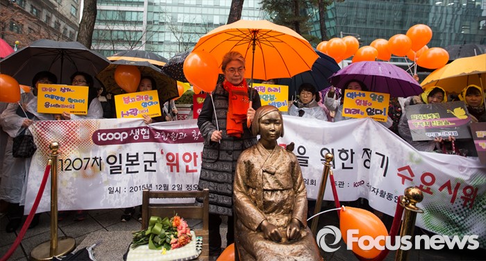 (서울=포커스뉴스) 2일 오후 서울 종로구 옛 주한일본대사관 앞에서 한국정신대문제대책협의회를 비롯한 집회 참석자들이 '제1207차 일본군 위안부 문제해결을 위한 정기 수요시위' 집회를 하고 있다.