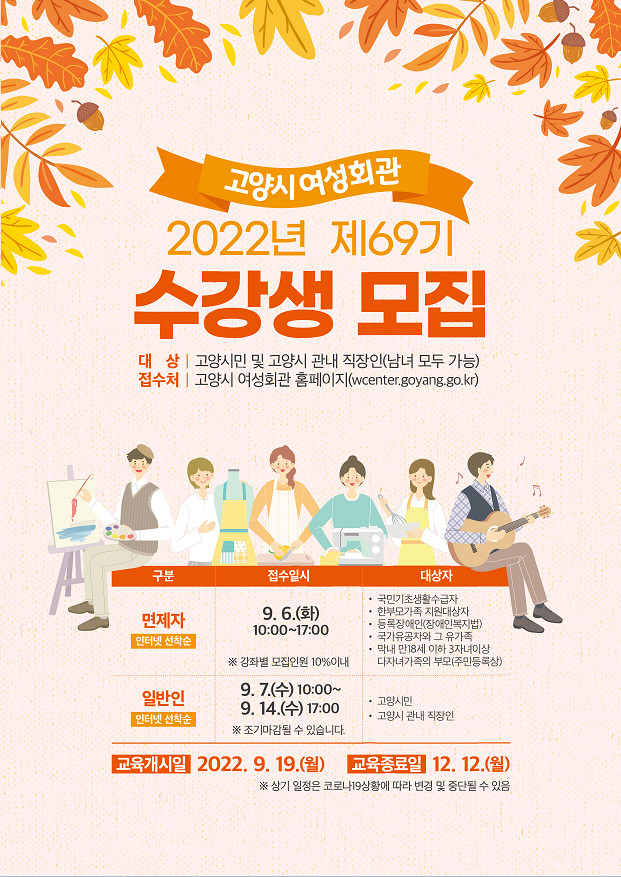 [부자동네타임즈 김인수기자] 고양특례시(시장 이동환) 여성회관이 9월 6일부터 9월 14일까지 2022년 제69기 정규강좌프로그램 수강생을 모집한다. 이번 강좌에는 한식 요리사 자격증, 양재 기능사, 컴퓨터 자격증, 헤어커트반 등 다양한 취·창업 강좌와 기타, 드럼, 장고, 우쿨렐레, 한국무용, 유화반 등 취미 강좌가 운영될 예정이다.