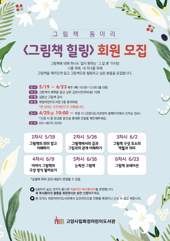 접수는 4월 25일(월) 오전 10시부터 고양시도서관센터 홈페이지에서 선착순으로 모집하며 기타 자세한 사항은 화정어린이도서관으로 문의하면 된다.
