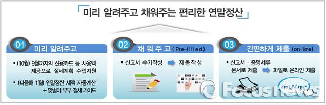 정부3.0추진위원회와 국세청은 3일 "내년 연말정산 결과를 예상해 미리 알려주고 공제·한도액 등을 계산, 신고서(소득‧세액공제신고서)에 채워주면 출력물없이 온라인으로 신고하는 연말정산 서비스를 제공한다"고 밝혔다.