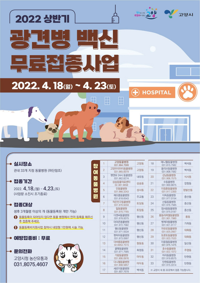 [부자동네타임즈 김인수기자] 고양시는 4월 18일부터 23일까지 광견병 예방접종을 지역 내 동물병원 33개소에서 실시한다고 밝혔다.