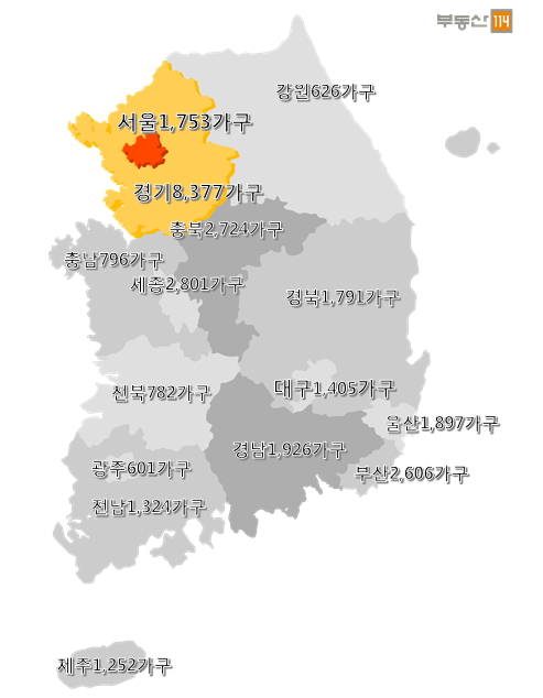 이밖에 ▲충북(2724가구) ▲부산(2606가구) ▲경남(1926가구) ▲울산(1897가구) ▲경북(1791가구) ▲대구(1405가구) ▲전남(1324가구) ▲제주(1252가구) ▲충남(796가구) ▲전북(782가구) ▲강원(626가구) ▲광주(601가구) 순으로 입주물량이 많다.