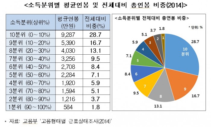 2014년도 임금근로자 중 10분위(상위 10% 이상)의 총 연봉은 임금근로자 전체 연봉의 28.7%를 차지했다.