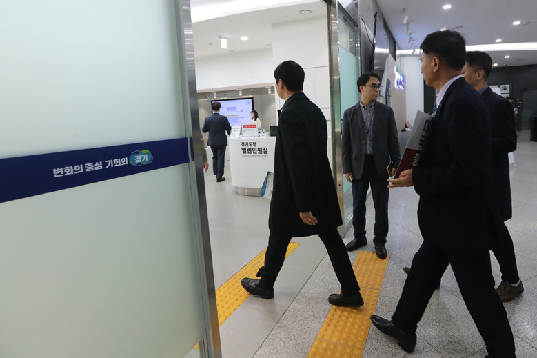 15일 오후 경기도청 앞에서 편파적인 종교탄압 규탄 결의대회가 마친 뒤 신천지예수교회 관계자들이 경기도청 관계자들과 면담하기 위해 경기도청사 민원실로 입장하는 모습.