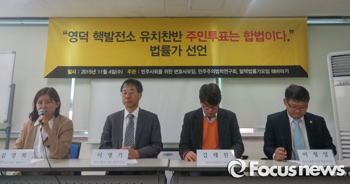 이날 사회를 맡은 이정일 민변 변호사는 "이희진 영덕군수가 원자력발전소 유치 관련 주민투표를 불법이라고 주장해 지역 주민들이 참석하는 것에 불안감을 갖고 있다"며 "법률가 단체로서 현 상황을 묵과할 수 없어 주민투표는 불법이 아니라는 점을 확실히 밝히고자 기자회견을 갖게 됐다"고 설명했다.