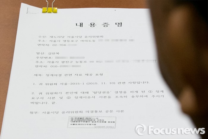 △ 18일 오전 서울 여의도 국회에서 열린 새누리당 최고중진연석회의에 '탈당권고' 징계가 내려진 김만복 전 국정원장이 자신의 징계처분과 관련 한 자료를 요구하는 내용증명이 놓여 있다. <사진제공=포커스뉴스> |