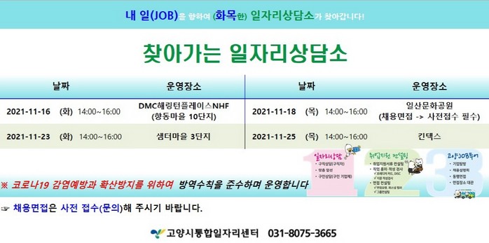 찾아가는 일자리상담소는 11월 16일(화) 향동마을 10단지, 11월 18일(목) 일산문화공원, 11월 23일(화) 샘터마을 3단지, 11월 25일(목) 킨텍스로 이동해 구직자를 기다린다.