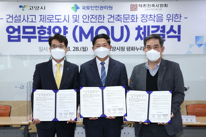 [부자동네타임즈 김인수기자] 고양시는 국토안전관리원, 고양지역건축사협회와 건설사고 제로도시를 만들기 위한 ‘건설사고 예방 상시협력체계 구축 업무협약(MOU)’을 28일 체결했다고 밝혔다.