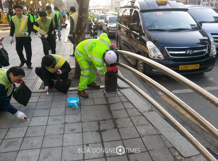 우선 물청소차가 차도와 보도에 쌓인 미세먼지를 깨끗하게 씻어내고 공무원과 주민들은 곳곳에 놓아둔 양동이에 물을 받아 스펀지와 수세미를 이용해 가드레일과 가로휴지통, 빗물받이 등 거리시설물에 오랫동안 밴 찌든 때와 얼룩을 닦아낸다.