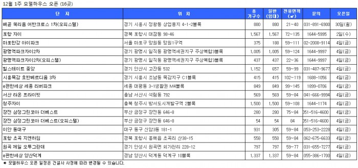 | △ 12월 첫 주 모델하우스 분양 현황. <자료제공=닥터아파트> |