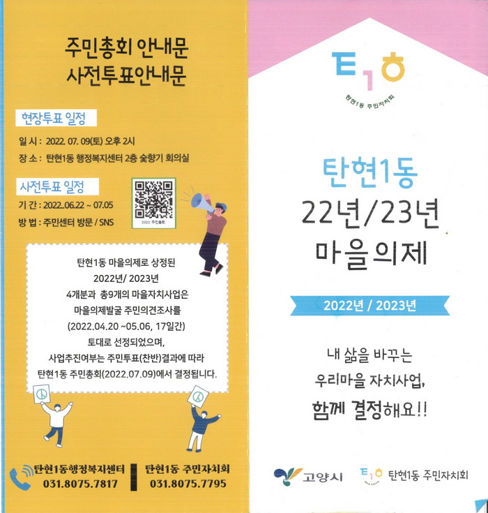 [부자동네타임즈 김인수기자] 고양시 탄현1동 행정복지센터(동장 박상원)에서는 2022년 탄현1동 주민자치사업의 원활한 추진을 위한 ‘주민총회 사전투표’를 온라인 및 오프라인으로 진행한다고 밝혔다.