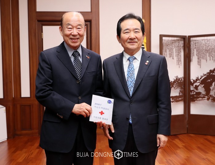 [부자동네타임즈 조영재 기자]정세균 의장은 4월 3일(화) 오전 국회의장 집무실에서 적십자 특별회비 전달식을 갖고 박경서 대한적십자사 회장에게 특별회비를 전달했다.