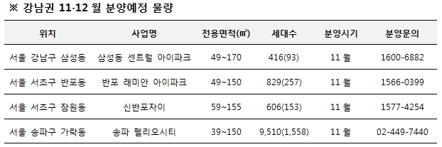 현대산업개발과 삼성물산은 11월 중 서초구 반포동에서 서초 한양아파트를 재건축하는 '반포 래미안 아이파크'를 공급한다.