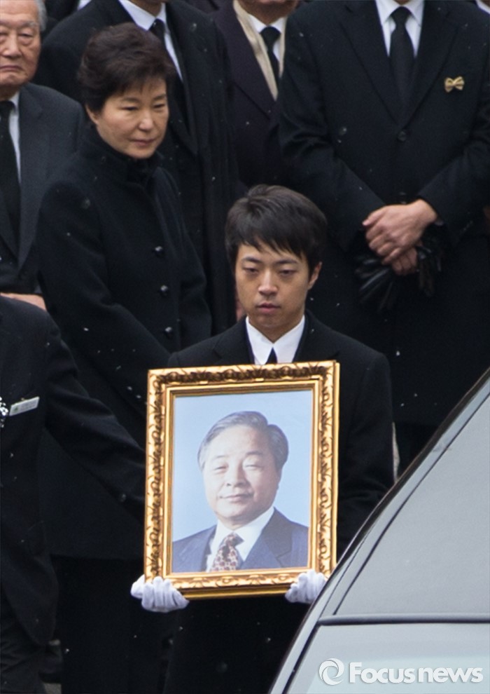 (서울=포커스뉴스) 박근혜 대통령이 26일 오후 서울 종로구 서울대병원 장례식장에서 김영삼 전 대통령의 발인식에 참석해 김 전 대통령의 영정사진을 바로보고 있다.