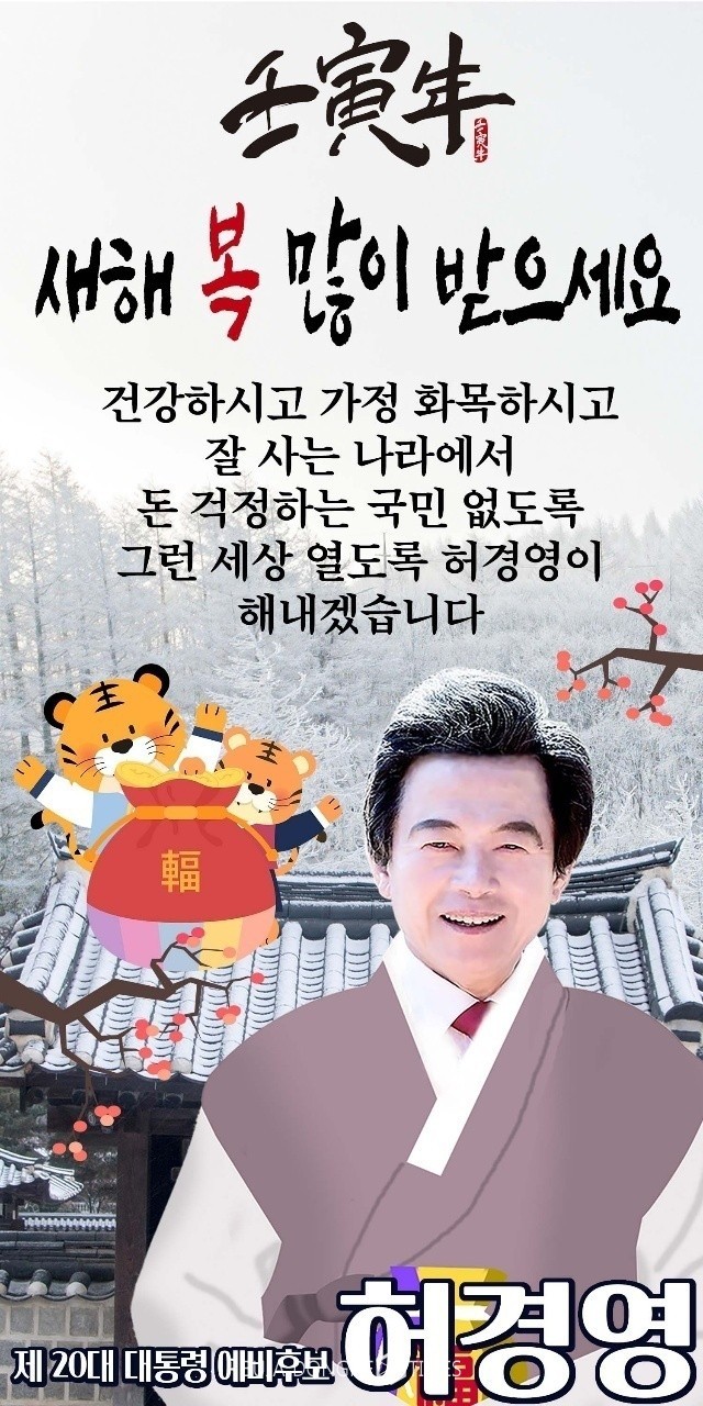 허경영 후보는 “호랑이 해 명절인 설날의 아침이 밝았다.”며 “올해는 호랑이의 기세로 온갖 어려움을 헤쳐 나가자”고 말하고 “3월 9일 투표 날 허경영을 선택하면 돈 걱정 없는 세상이 된다.”고 덕담했다.