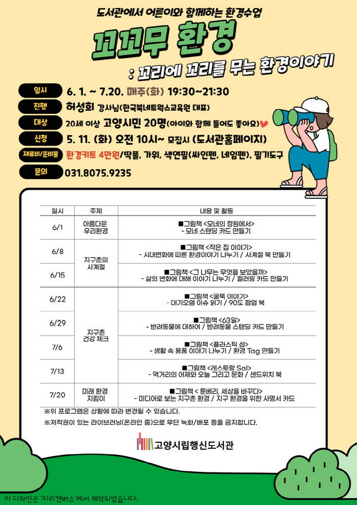 [부자동네타임즈 김인수기자] 고양시 행신도서관은 오는 6월 1일부터 온라인 환경강좌‘꼬꼬무 환경: 꼬리에 꼬리를 무는 환경이야기’를 운영한다.