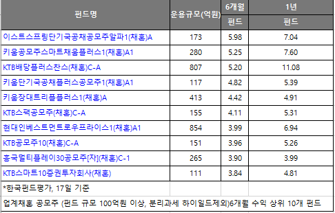 한국펀드평가 펀드스퀘어에 따르면 17일 기준 이스트스프링 단기 국공채 공모주 알파 증권투자신탁 제1호[채권혼합](클래스 A기준)는 5.98%의 6개월 성과를 나타냈다. 이는 동기간 업계 채권혼합형 공모주 유형 펀드(100억원 이상, 퇴직연금 제외) 가운데 가장 높은 성과다. 3개월, 1년 수익률도 각각 3.99%, 7.04%의 안정적인 운용을 보이고 있다.