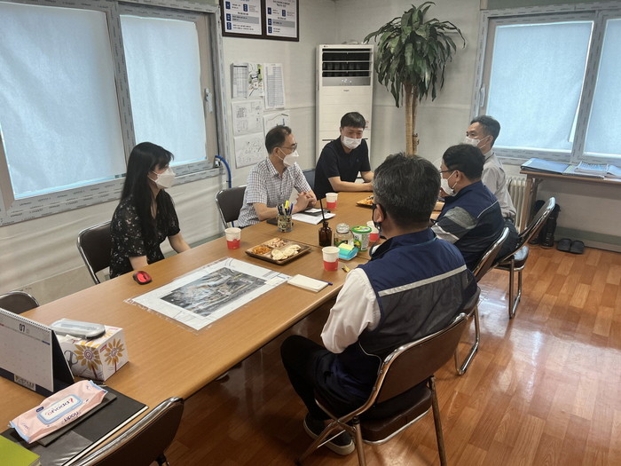 [사진설명] 고양시 관계자가 덕은지구 주택건설사업장 관계자를 만나 건설업계 애로사항을 청취하고 있다. (2022.7.6.)