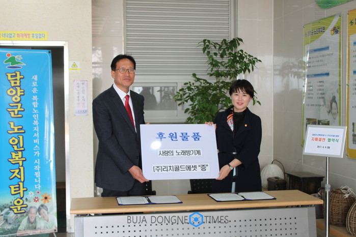 (주)리치골도에셋(대표이사 장민경)은 지난 4일 복합노인복지시설 담양군노인복지타운(원장 이동오)을 방문해 자매결연을 체결하고 오래된 노래방기기를 최신 기기로 교체해 주어 훈훈한 미담이 되고 있다.