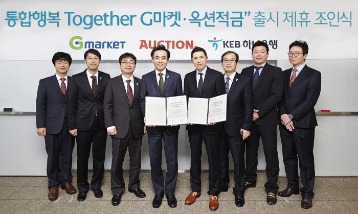 | △ KEB하나은행과 이베이코리아 관계자들이 5일 G마켓·옥션 적금 제휴 조인식을 개최한 후 기념사진을 찍고 있다. <사진제공=KEB하나은행> |