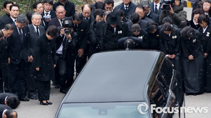 | △ 박근혜 대통령과 유가족들이 26일 오후 서울 종로구 서울대병원 장례식장에서 김영삼 전 대통령의 발인식에 참석해 운구차량으로 옮겨지는 김 전 대통령에게 인사를 하고 있다. <사진제공=포커스뉴스> |