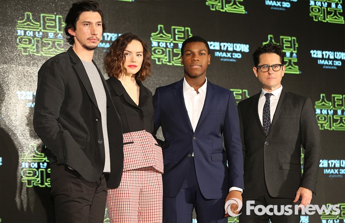 (서울=포커스뉴스) 9일 오전 서울 영등포구 여의도 콘래드 호텔에서 열린 영화 '스타워즈 : 깨어난 포스' 프레스 콘퍼런스에 참석한 배우 아담 드라이버(왼쪽부터), 데이지 리들리, 존 보예가와 J.J. 에이브럼스 감독이 포토타임을 갖고 있다.