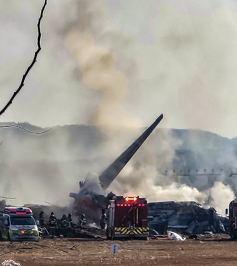 29일 오전 전남 무안국제공항에서 착륙 중이던 항공기가 활주로를 이탈해 울타리 외벽을 충돌했다. 사진은 사고 현장에서 소방 당국이 인명 구조를 하는 모습. 2024.12.29