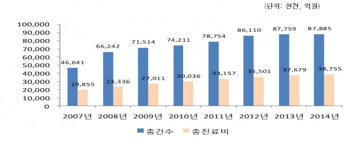 진료비 역시 2007년 약 1조9860억원에서 2014년 약 3조8760억원으로 약 1조8890억원(95.2%)이 늘어났다.