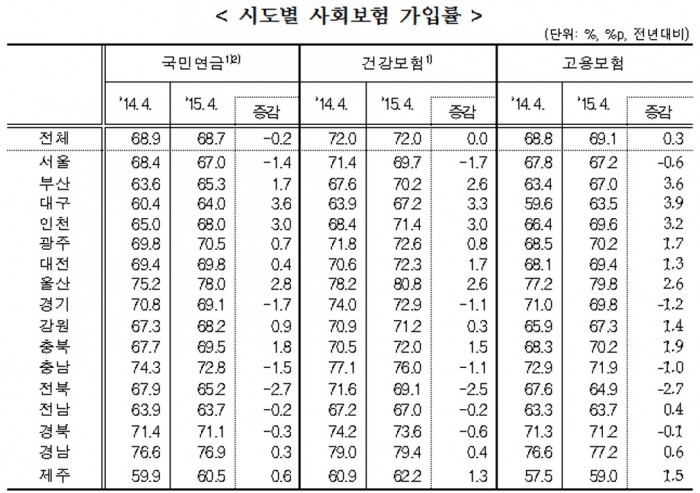 또 울산, 경남, 충남은 16개 시도에서 국민연금 등 사회보험 가입률이 가장 높았다. 반면 제주, 전남, 대구는 가입률이 낮은 순에 속했다.