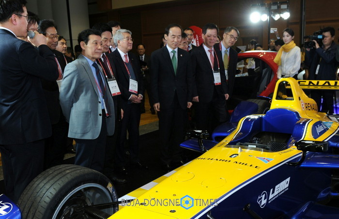 △ 윤장현 광주광역시장은 18일 오후 제주국제컨벤션센터에서 열린 제3회 국제전기자동차엑스포 개막식에 참석해 윤성규 환경부 정관 등과 함께 전시장을 둘러보고 있다