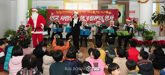 따뜻한 연말을 위한 사랑나눔 행사에 빛고을타운 남자회원으로 구성된 아버지요리교실에서 닭강정을 만들어 함께 전달하고 빛고을예술봉사단 아코디언반에서는 캐롤 연주로 훈훈한 연말 분위기를 연출했다.