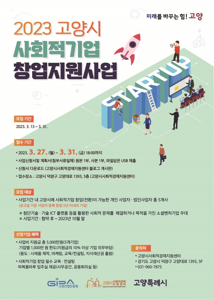 센터는 ‘2023년도 고양시 사회적기업 창업 지원사업’을 고양산업진흥원 홈페이지와 센터 블로그 등을 통해 공모 중이며, 오는 3월 27일부터 31일까지 신청서를 접수한다.