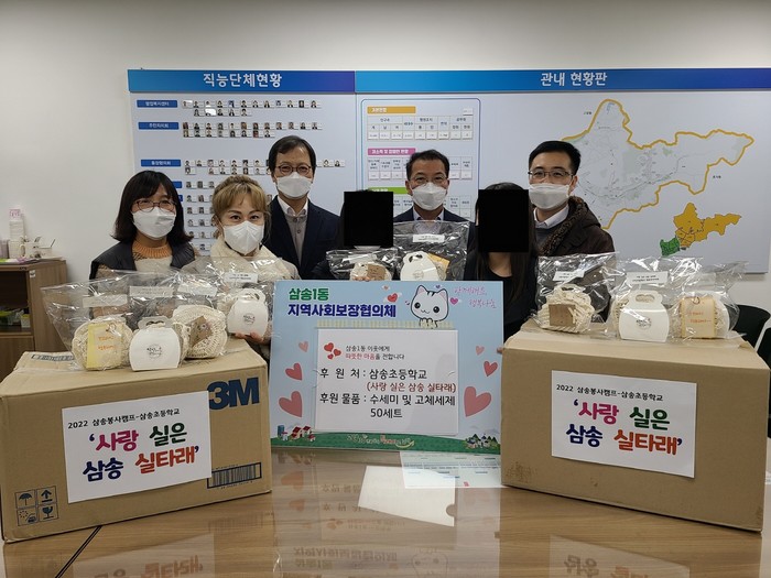 삼송초등학교의 ‘사랑 실은 삼송 실타래’는 삼송초등학교 학생·학부모, 교사가 함께 손뜨개질로 봉사하는 모임으로, 2016년부터 따뜻한 나눔을 실천하고 있다. 작년에는 목도리 60개를 만들어 전달한 것에 이어 올해는 환경을 생각해 만든 수세미 250여 개와 고체 주방 세제를 만들어 전달했다.