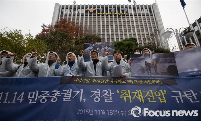 (서울=포커스뉴스) 18일 오후 서울 서대문구 경찰청 앞에서 전국언론노동조합, 한국사진기자협회 등 16개 언론단체 소속 회원들이 경찰의 11.14 민중총궐기대회 취재 진압을 규탄하는 기자회견을 열고 있다.