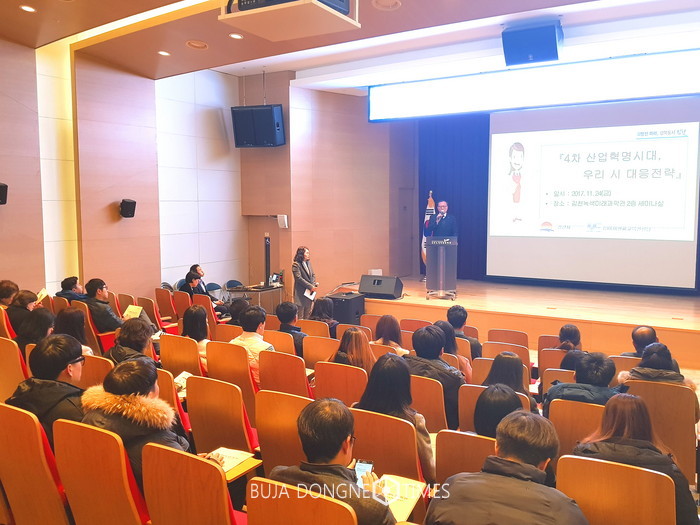 [부자동네타임즈 서소민 기자]김천시는 24일 김천녹색미래과학관 세미나실에서 시청 및 읍면동 직원 200여명이 참석한 가운데,‘4차 산업혁명 시대, 우리는 무엇을 할 것인가?’이라는 주제로 특강을 실시했다.