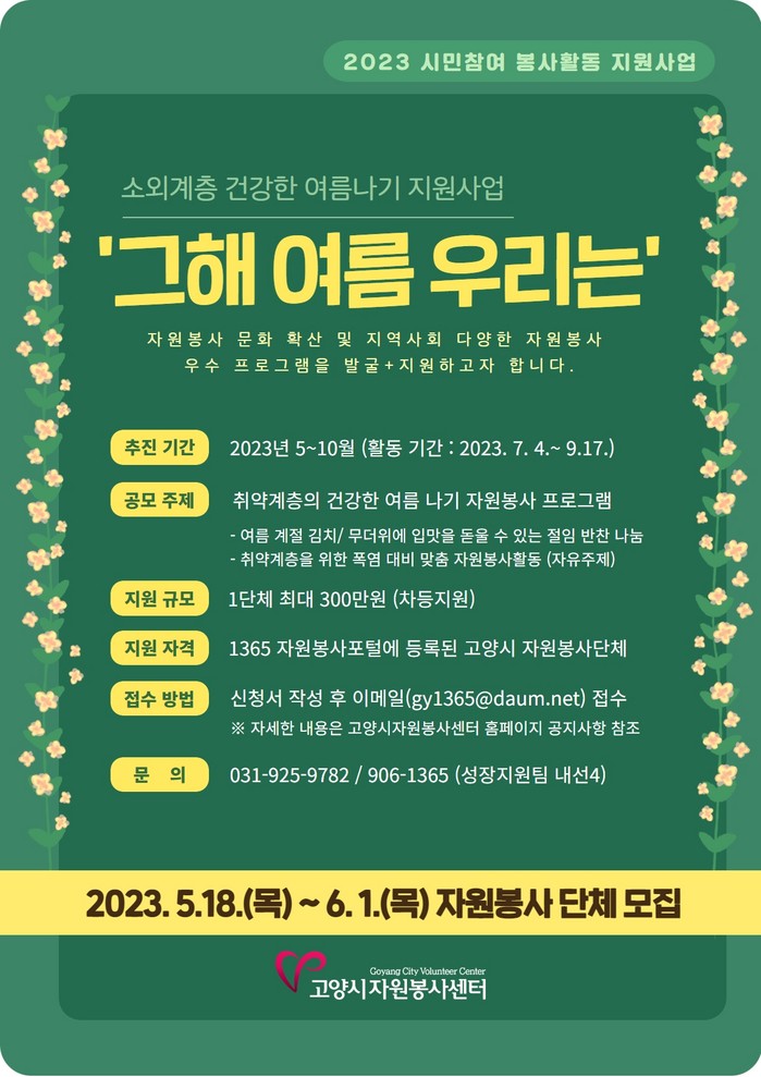참여를 희망하는 자원봉사단체는 고양시자원봉사센터 홈페이지 공지사항에서 자세한 내용을 확인할 수 있으며, 신청서는 6월 1일(목)까지 이메일로 제출하면 된다.