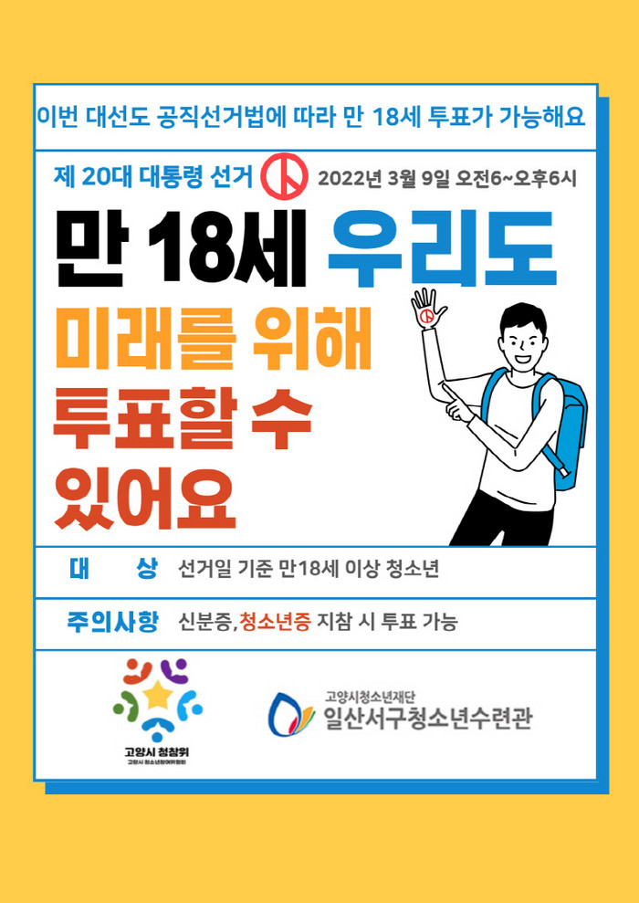 [부자동네타임즈 김인수기자] 고양시청소년재단 일산서구청소년수련관에서 청소년들의 참여와 권리를 확산하기 위한 청소년 참정권 이벤트를 현재부터 3월 9일 18시까지 진행된다.