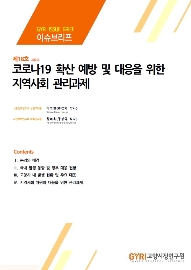 이전 보고서에서 ‘코로나19’에 피해를 입은 소상공인을 대상으로 지원 정책을 중점적으로 살펴보았다면, 이번에 발표한 ‘코로나19 확산 예방 및 대응을 위한 지역사회 관리과제(연구책임: 이정철 부연구위원)’에서는 국내 발생동향 및 정부대응과 고양시의 대응현황을 살펴보고, 네 가지 측면(방역체계 관리, 피해구제 및 생활불편 해소, 안전약자 및 취약계층 지원, 시민의 자발적 참여)에서 주요 선례들을 분석함으로써 고양시 차원에서 지역사회 내의 ‘코로나19’ 확산을 예방하고 효과적으로 대응하기 위해 고려해야 할 관리과제들을 제안하였다.
