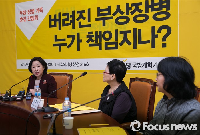 (서울=포커스뉴스) 심상정(왼쪽) 정의당 대표가 18일 오후 서울 여의도 국회에서 열린 '부상 장병 가족 초청 간담회, 버려진 부상장병 누가 책임지나?'에 참석해 인사말을 하고 있다.