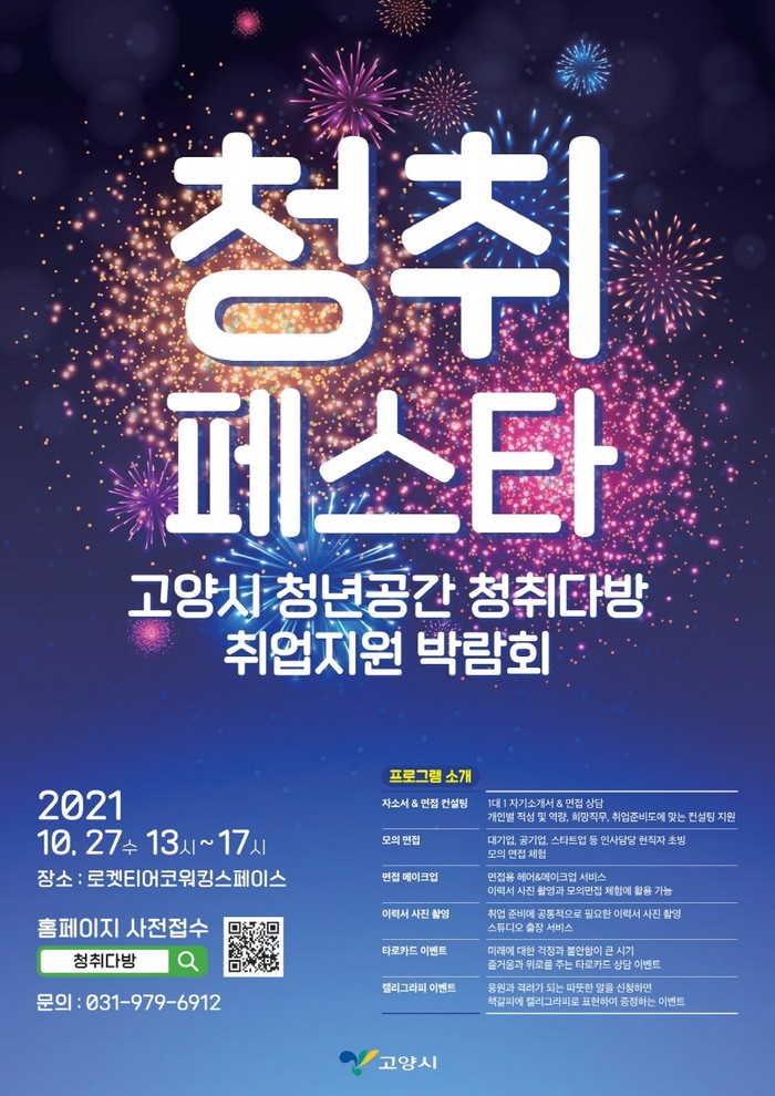 2021 청취페스타에는 고양시 청년들이 참여할 수 있는 취업프로그램들이 가득하다. 현직 인사담당자를 직접 만나볼 수 있는 ‘모의면접’, 1대1 취업 상담을 통한 개인별 적성, 역량, 희망직무 등 취업준비 맞춤 ‘자소서&면접 컨설팅’, 전문가의 손길로 달라지는 ‘면접 메이크업’, 출장 나온 사진관 ‘이력서 사진 촬영’, 청년이 듣고 싶은 따뜻한 응원, 격려의 말을 캘리그라피 책갈피로 제작해주는 ‘캘리그라피 이벤트’, 미래에 대한 불안함이 큰 시기 타로카드 상담을 통해 즐거움과 위로를 전달하는 ‘타로 이벤트’ 등 다양한 프로그램들이 준비되어 있다.