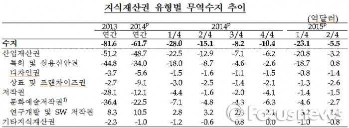 유형별로 상표 및 프랜차이즈권(-2억6000만달러), 문화예술저작권(-2억7000만달러)을 중심으로 적자를 보였다.