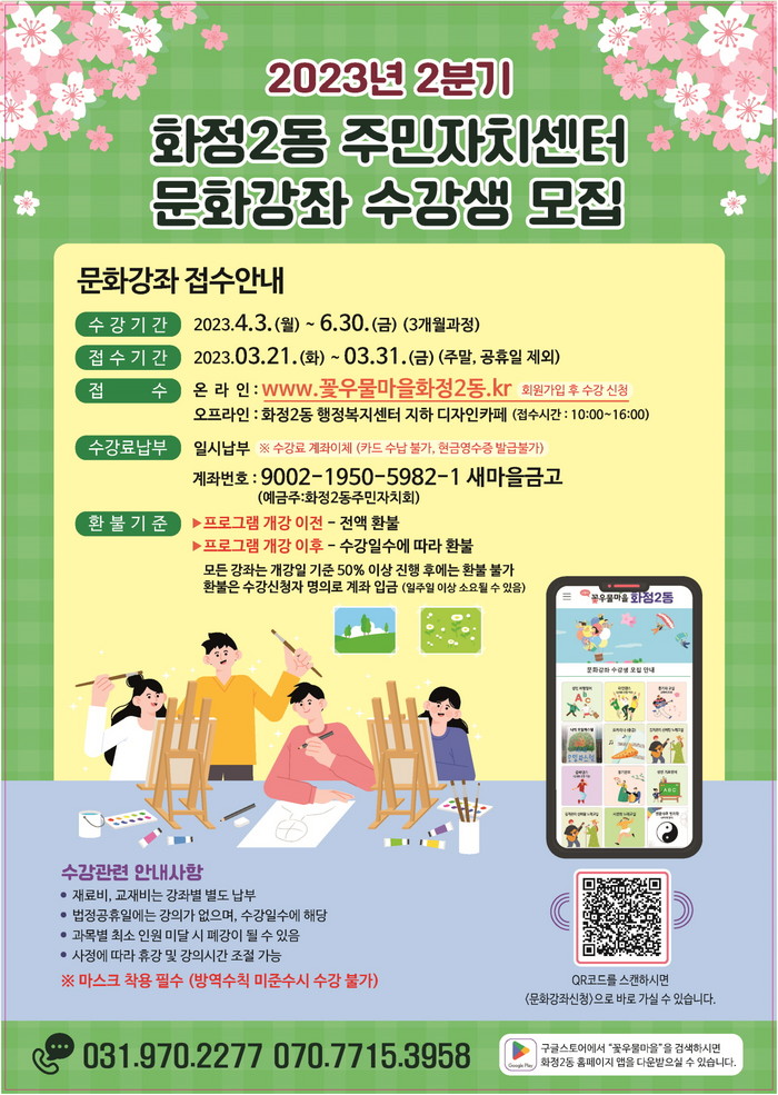 [부자동네타임즈 김인수기자] 고양특례시 화정2동 주민자치회는 오는 3월 21일부터 31일까지 ‘2023년 2분기 주민자치센터 문화강좌’ 수강생을 모집한다.