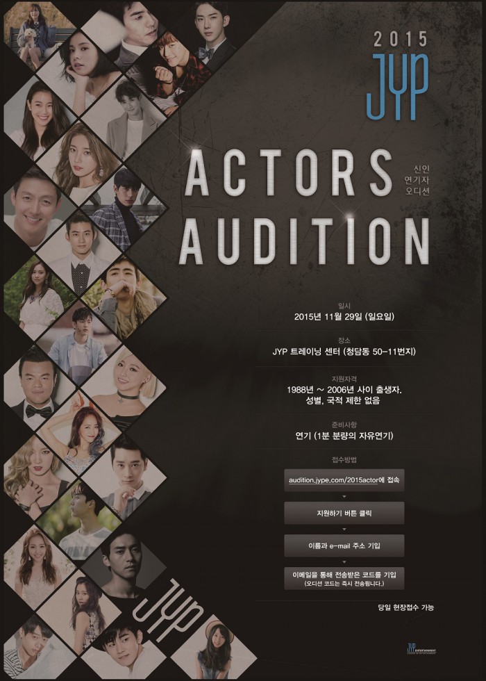 소속사 JYP엔터테인먼트는 30일 "신인 연기자를 뽑는 오디션이 오는 11월 29일 JYP 트레이닝 센터에서 연다"고 밝혔다.
