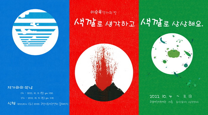 ‘색깔로 생각하고 색깔로 상상해요’라는 주제로 열리는 이번 전시회는 이순옥 작가의 대표작 하늘 조각과 초록초록, 빨강등 그림책 작품을 선보인다.